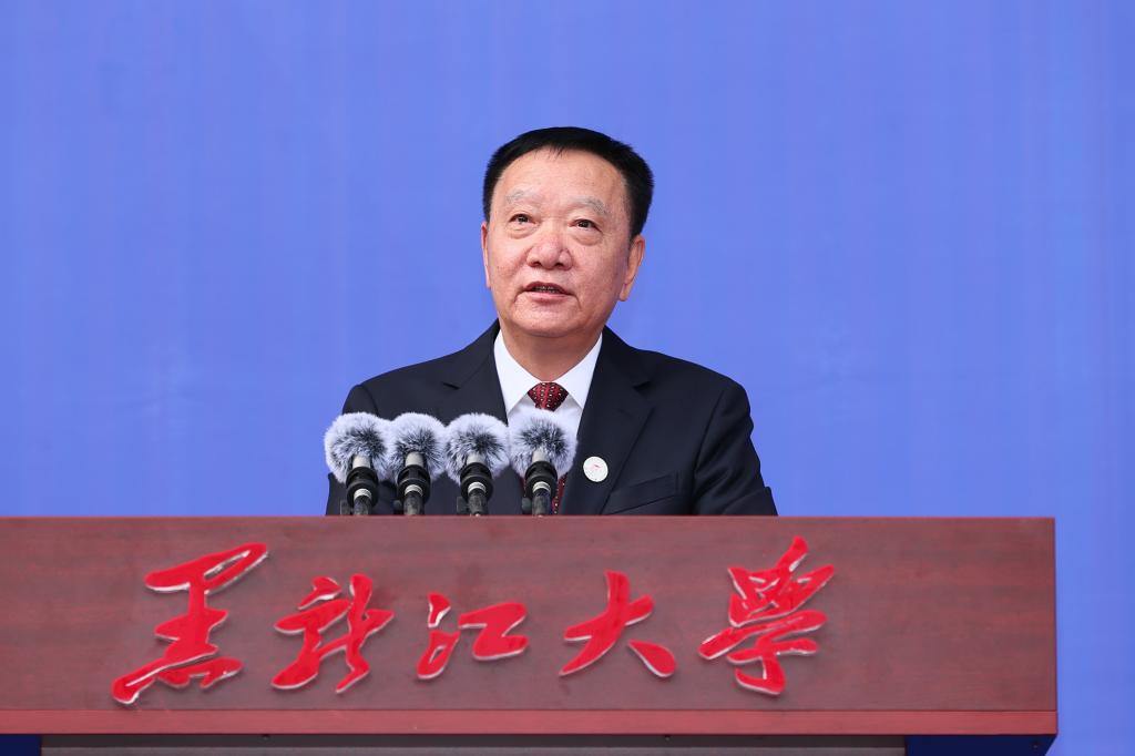 黑龙江大学1979级化学系校友、中国工程院院士程杰成作为校友代表讲话。他深情回顾了在校求学的往事,并勉励同学们要“心贴紧家国”“书念到大地”“眼看得广阔”“劲用在长久”,用真才实学服务人民、贡献国家。