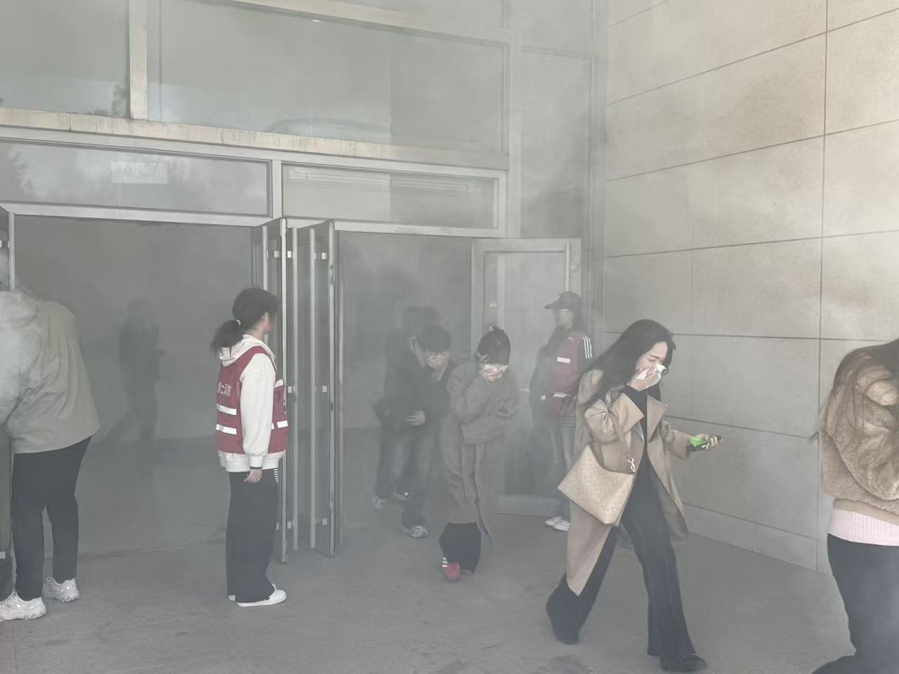 崔本强宣布演练正式启动。本次演练模拟图书馆突发火情,政府管理学院师生、图书馆馆员以及在第二图书馆学习的师生160余人参与演练。随着警报响起,现场释放模拟浓烟,参与演练师生严格遵守逃生规范,做好自我防护,弯腰低姿、用湿毛巾捂住口鼻,沿预定路线撤离,整个疏散过程快速有序,演练任务圆满完成。