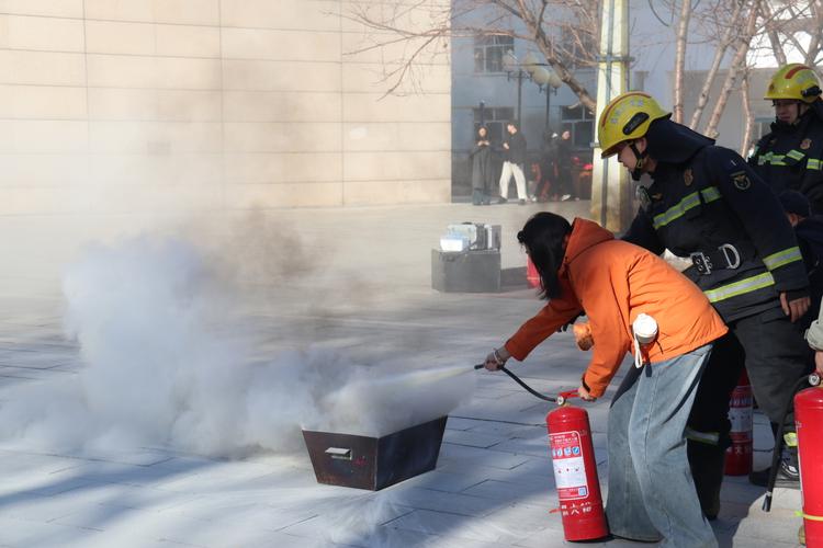 疏散演练结束后,中兴大道消防救援站消防员现场讲解火场逃生自救常识,细致科普灭火器用途及标准使用流程,并组织师生开展灭火实操训练。在工作人员的指导下,师生依次完成提取罐体、拔除保险销、按压开关、对准火源根部扫射的全套规范操作。