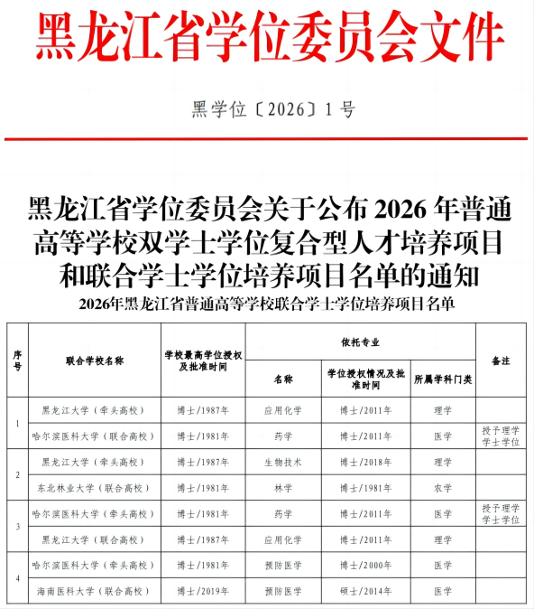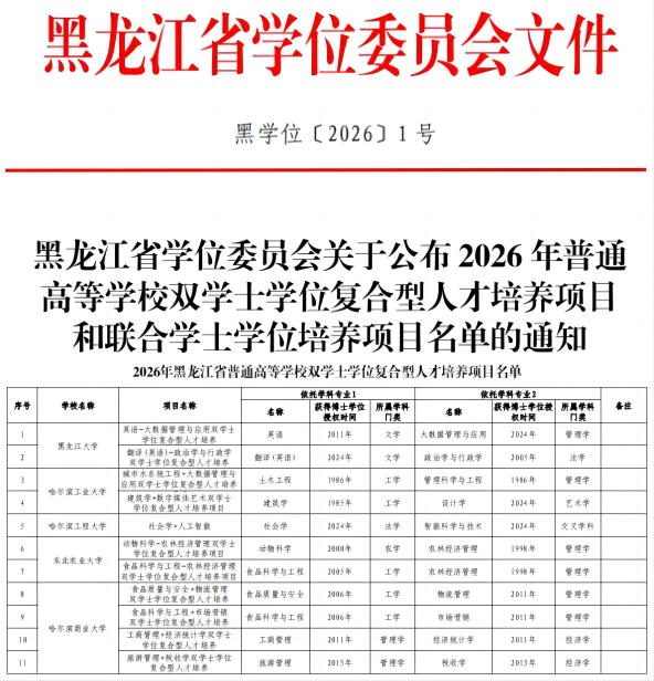 4月13日,黑龙江省学位委员会正式发布《黑龙江省学位委员会关于公布2026年普通高等学校双学士学位复合型人才培养项目和联合学士学位培养项目名单的通知》,“黑龙江大学应用化学-哈尔滨医科大学药学”“黑龙江大学生物技术-东北林业大学林学”联合学士学位培养项目(以下简称“联合学位项目”)成功获批,全省共批准4项,我校是省内首批实施跨校、跨专业联合学士学位培养模式的高校,分别作为牵头高校和联合高校参与其中3项。同时,学校“英语-大数据管理与应用”“翻译(英语)-政治学与行政学”双学士学位复合型人才培养项目(以下简称“双学士学位项目”)成功获批,截止目前,学校共获批8个双学士学位项目。