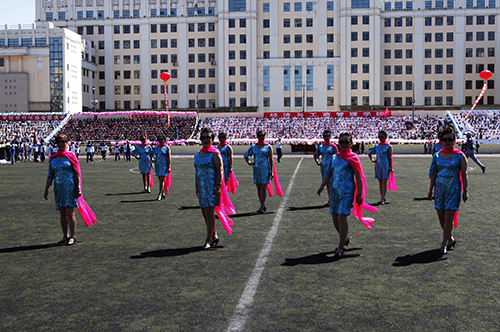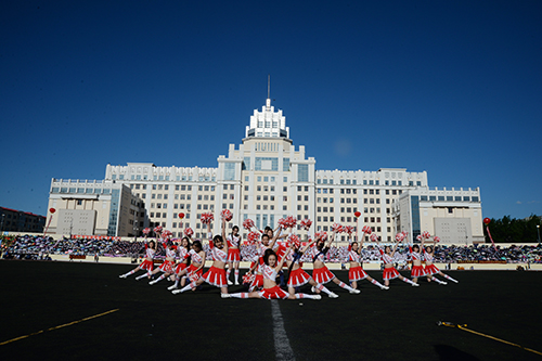 由黑大幼儿园小朋友表演的韵律操《三字经》和古诗词背诵表演,给运动会现场营造了童趣欢乐的气氛。小朋友们跟随音乐的节拍一边跳操一边大声背诵着《三字经》、古诗词,整齐划一的舞蹈动作和脍炙人口的古诗词将现代元素与古风有机融合,使文艺汇演的开篇节目充满创意。