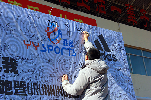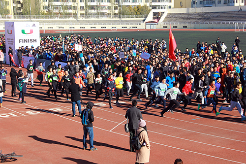我校体育部党支部书记、体育部主任郭金丰致辞。他指出,本次URunning校园跑步比赛,是大力推进素质教育的重要体现,是展现我校师生精神面貌和综合素质的一个窗口。在提到为什么将这个比赛设在这么冷的天气时,他谈道,因为天气渐渐冷了以后,同学们的运动量也会减少,我们的想法就是,在感受寒冷冰城的魅力的同时,散发我们对体育的热情。
