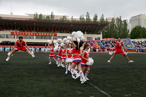 运动场上,比赛如火如荼地进行着,运动员们积极奋战,努力拼搏。此时,韵律操、军体拳表演、满族舞蹈、摔跤表演、啦啦操、广播操等文艺汇演也在进行着,为赛场持续助力。