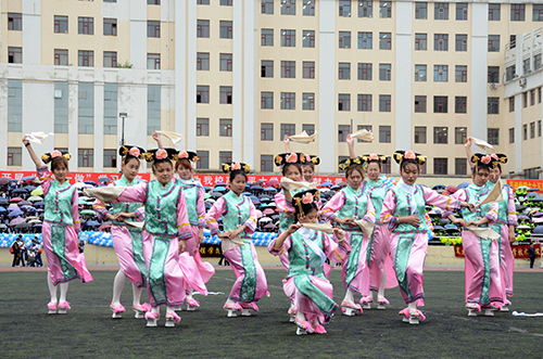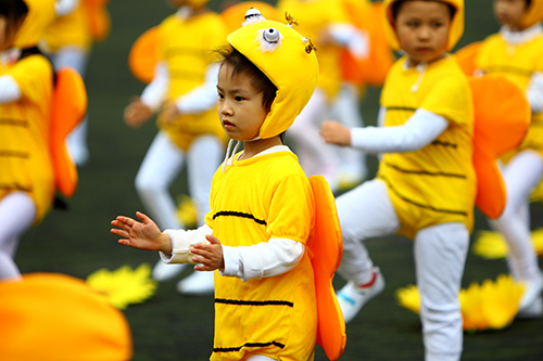 开场由黑大幼儿园小朋友们带来的韵律操表演,充满童真,流露出儿童的可爱与活力。60名小朋友,身穿鲜黄色的小蜜蜂服装,随着音乐的变化挥舞着小手,一张张灿烂的笑脸,在运动场上蹦蹦跳跳,她们背后的翅膀也随之扇动着,更显活泼俏皮,赢得了现场观众的阵阵掌声。