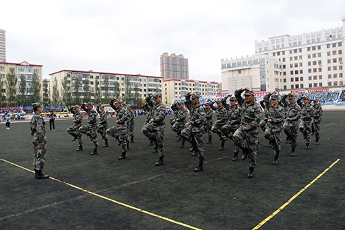 2015级国防生带来的军体拳表演也同样精彩。他们的步伐整齐划一,口号振奋人心,出场就赢得了现场的欢呼声。帅气统一的动作,虎虎生风,“呼”、“哈”的整齐口号响彻运动场,展示了我校国防生形象。