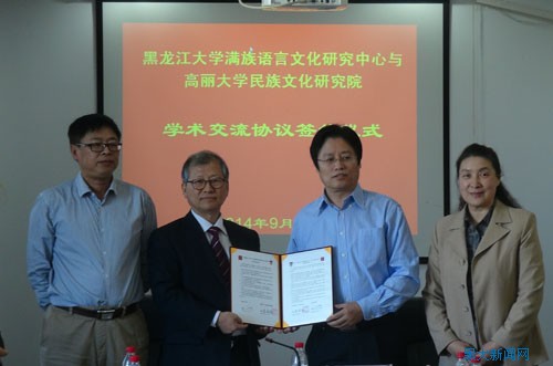 9月15日上午,我校满族语言文化研究中心与韩国高丽大学民族文化研究院学术交流签约仪式暨满语文学研究与学科建设发展研讨会在社科楼五楼会议室举行。韩国高丽大学民族文化研究院院长崔溶澈教授与韩国庆北大学教授洪性鸠,我校副校长丁立群等出席会议。会议由满族语言文化研究中心赵阿平教授主持。