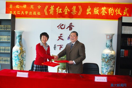 李小娟社长代表黑龙江大学出版社,王立民副主席代表黑龙江省萧红研究会共同签署了新版《萧红全集》的出版协议。签约仪式后,省作协副主席王立民、黑大出版社社长李小娟分别讲话。王立民在讲话中强调,当前我省正在实施“保护、挖掘历史文化资源”综合项目,作为项目的重要组成部分,《萧红全集》的出版不仅是我省乃至全国萧红研究的重要环节,也是保护、挖掘我省历史文化资源工作的重要方面。《萧红全集》的顺利签约,是我省文化领域中的一次盛事。同时,王副主席也高度评价了黑龙江大学出版社已取得的成绩,希望在其他领域能够开展更加广泛的合作。